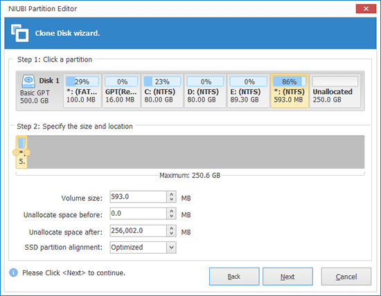 - Select the Unallocated space in destination disk and click Next.